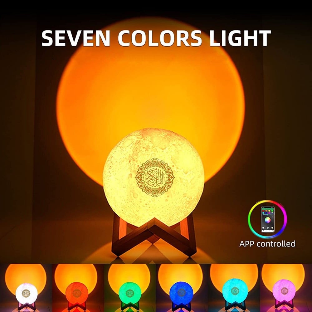 اضاءة ضوء القمر مزودة بمكبر صوت ، اضاءة ذكية تضم جميع سور القرآن الكريم باصوات اشهر القراء ، متميزة ب7 الوان مختلفة ، تضم 40 حديث شريف ، و مترجمة لأكثر من لغة للناطقين بغير اللغة العربية ومناسبة للتعليم