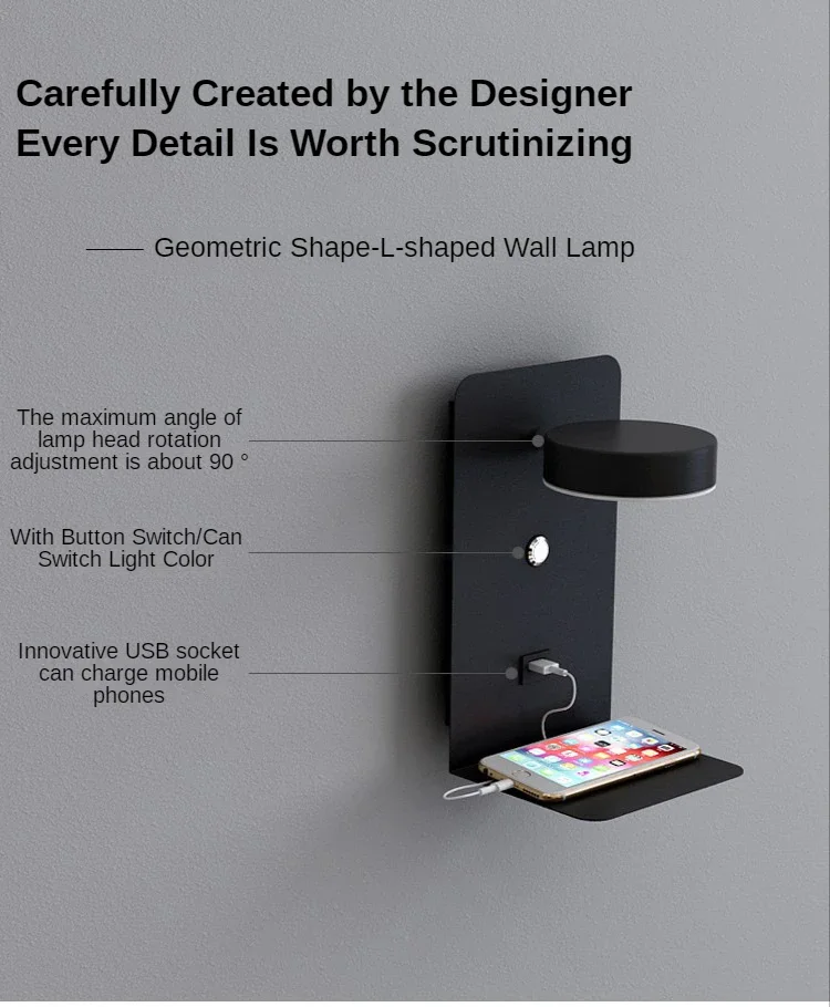 مصباح جداري مع رف حامل جوال مع إضاءة دافئة بثلاث ألوان بزر تشغيل مع منفذ فتحة USB نموذج يصنع لمسة راقية في غرفة النوم وأي مكان في المنزل مفيد ومريح بتصميم ذكي وأنيقعن المنتجقوة الإضاءة : 12W...