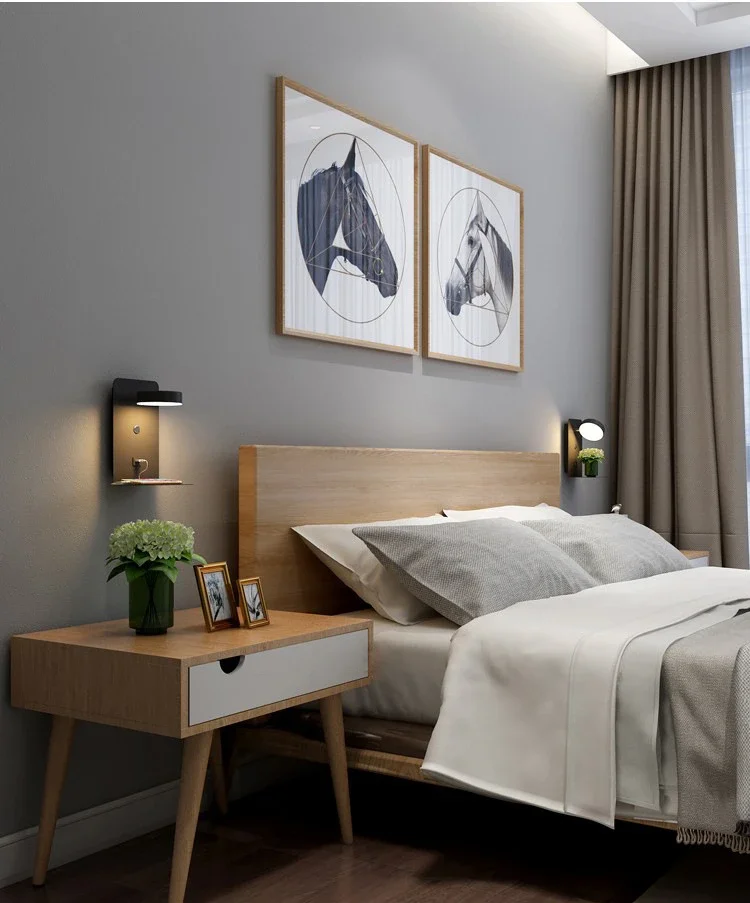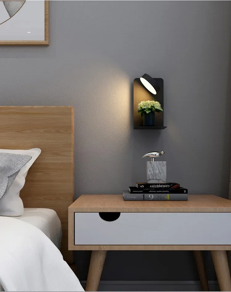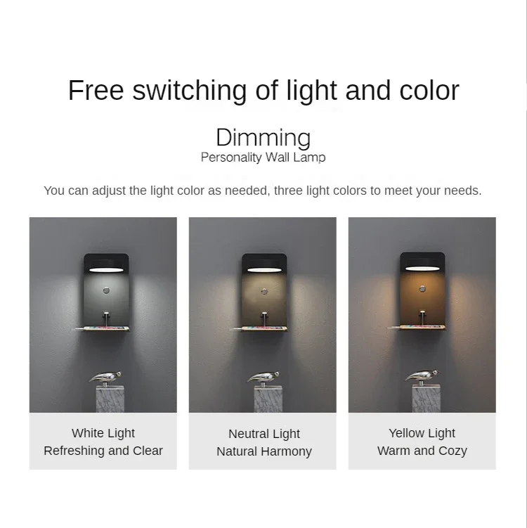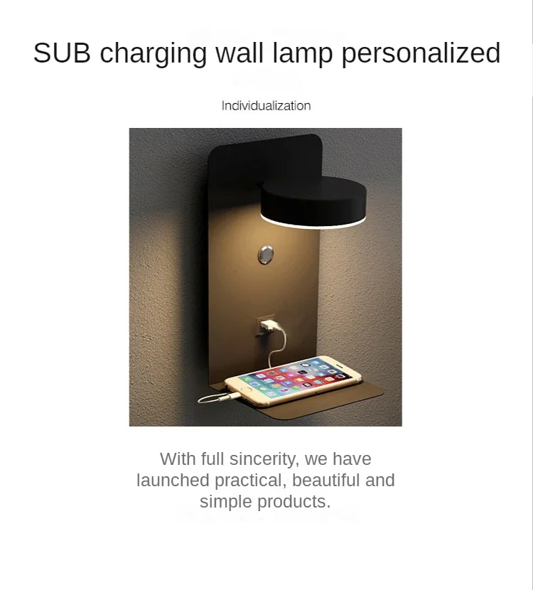 مصباح جداري مع رف حامل جوال مع إضاءة دافئة بثلاث ألوان بزر تشغيل مع منفذ فتحة USB